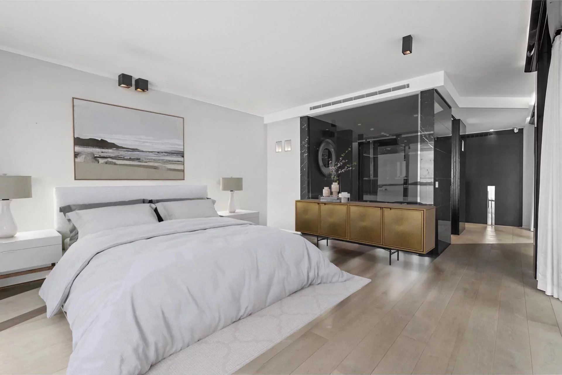The interior, designed in a minimalist and refined spirit, deploys high quality materials. The light parquet accentuates the natural brightness while the high-end finishes emphasize a discreet elegance. The apartment includes three bedrooms, each with its own private bathroom. The main suite, a true cocoon of serenity, opens onto a stunning blue horizon and includes a black marble bathroom.