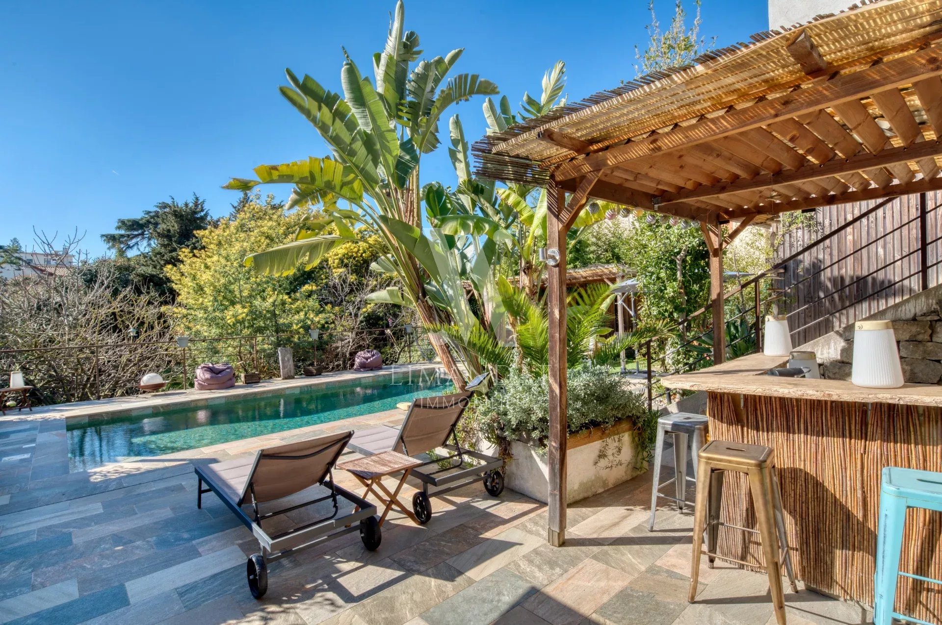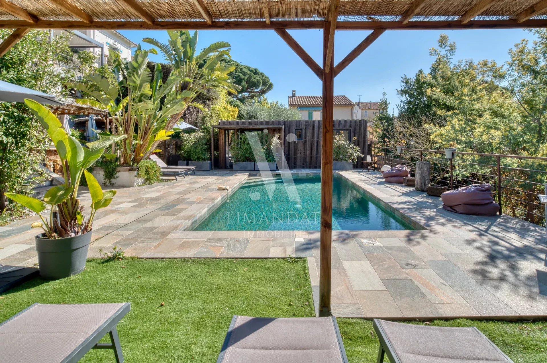 Le jardin est aménagé de plusieurs coins lounge autour d'une belle piscine, invitant à la détente et à la convivialité.