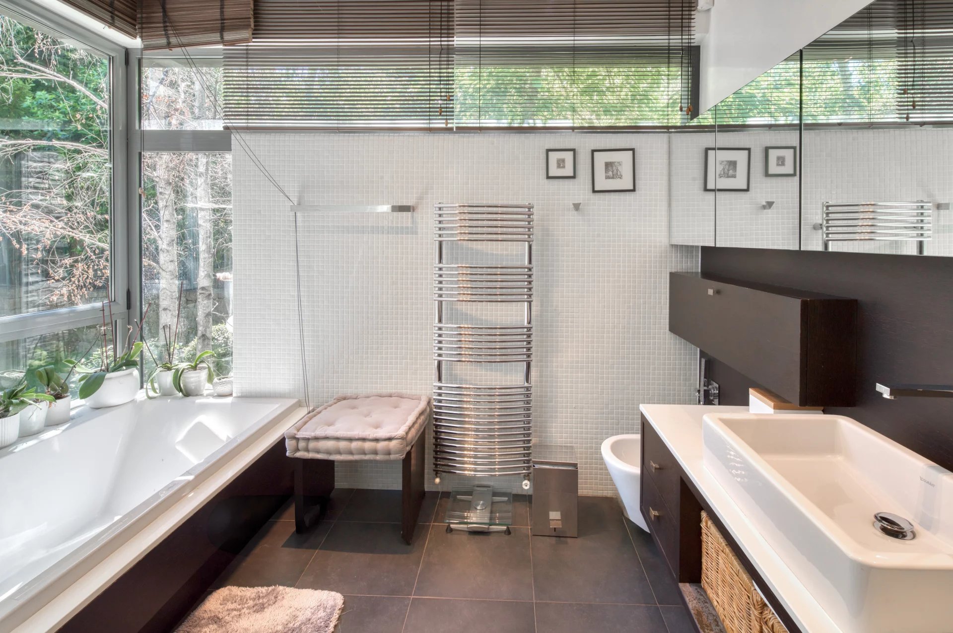À l’extérieur, le jardin arboré forme un écrin de verdure soigneusement entretenu. Le bassin inspiré de Bali, peuplé de carpes, une piscine à débordement avec une vue panoramique sur le jardin.